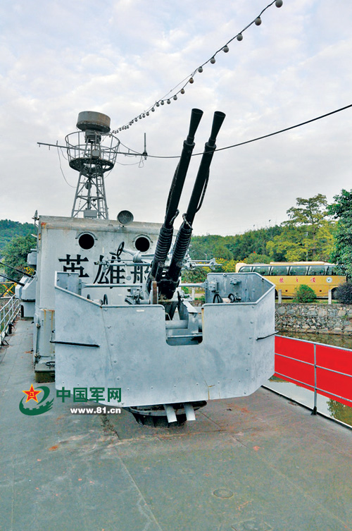 611艇是与2224艇(024型导弹快艇)一起“停泊”在人工湖里的。之所以要给停泊一词打上引号,是因为这两艘艇几乎没有接触水面,而是被托起在水面之上。611艇属于62级护卫艇,标准排水量在113吨左右,满载排水量也就130吨出头。作为一艘“小不点”式的舰艇,其艇艏和艇艉各有一座双联37毫米舰炮,艇舯部左右各有一座双联25毫米舰炮,火力可不敢小觑。