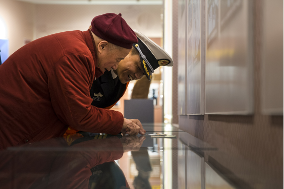2015年12月28日,参加海军主题活动暨“海空雄鹰团”命名50周年纪念大会的战斗英雄舒积成向年轻官兵介绍自己曾经使用过的装具。新华社记者琚振华摄