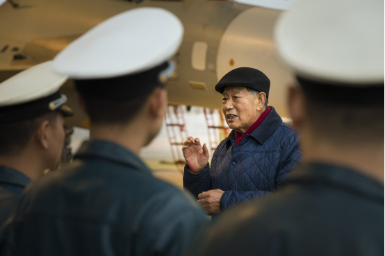 2015年12月28日,参加海军主题活动暨“海空雄鹰团”命名50周年纪念大会的战斗英雄马铭贤回到原来的飞行中队讲述战斗经历。新华社记者琚振华摄