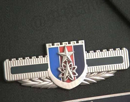 然后我们再来看看解放军军种大家族中的新成员,战略支援部队的胸标,构成这幅胸标的背景图案为抽象化了的长城与麦穗形象,中心图案为则依旧以金属五角星为支点,下面支撑以类似抽象的电磁信号塔和环绕地球的卫星与轨道之类的图案,整体图案的背后则缀以蓝、红、深蓝三色的条纹底色。