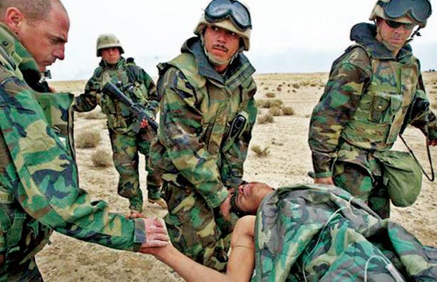 图为美军在伊拉克战场上受重伤的士兵。虽然子弹未能击穿防弹衣,但是巨大的动能使该士兵受到严重伤害。