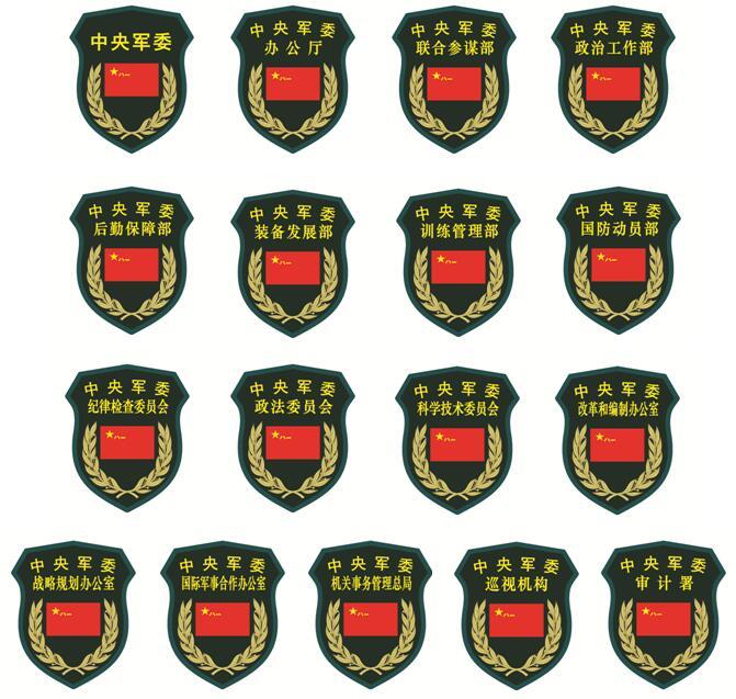 中央军委及其办事机构臂章设计。中央军委设“一厅、六部、三委、三办、一局、一署、一巡视机构”共16个单位,每个单位虽然分工不同、职能各异,但都是军委的办事机构,因此,除在每种臂章中标注各办事机构名称以示区别外,主标志均采用“八一”军旗。军旗代表引领军队走向胜利的灵魂和方向标,突出“八一”军旗,寓意军队最高领导权指挥权集中于党中央、中央军委这面旗帜下,强调了军委的集中统一领导作用。