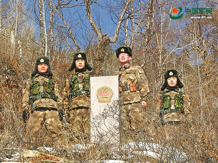 杜宏 (右二)生前与战友在界碑前留影。王浩博摄