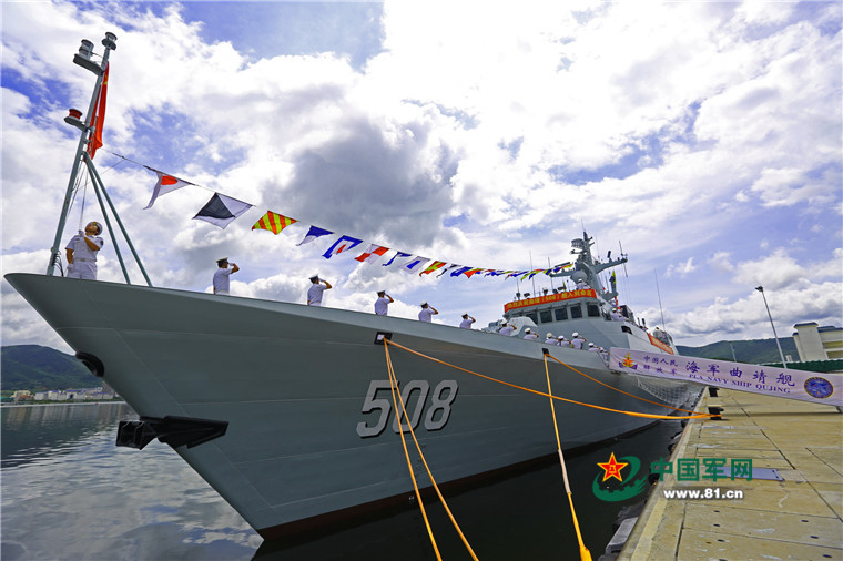 曲靖舰是我国自行研制建造的新一代轻型导弹护卫舰,舷号“508”,满载排水量1300余吨。该舰装备了多套我国自主研发的新型武器装备,信息化程度高,隐身性能好,可单独或者协同海军其他兵力攻击敌水面舰艇、潜艇,具有较强的防空、反潜和对海作战能力。