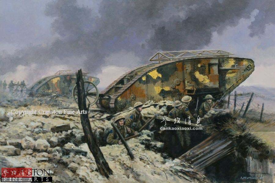 一战期间,英军Mark I(雄性)坦克准备向德军防线发起突击。