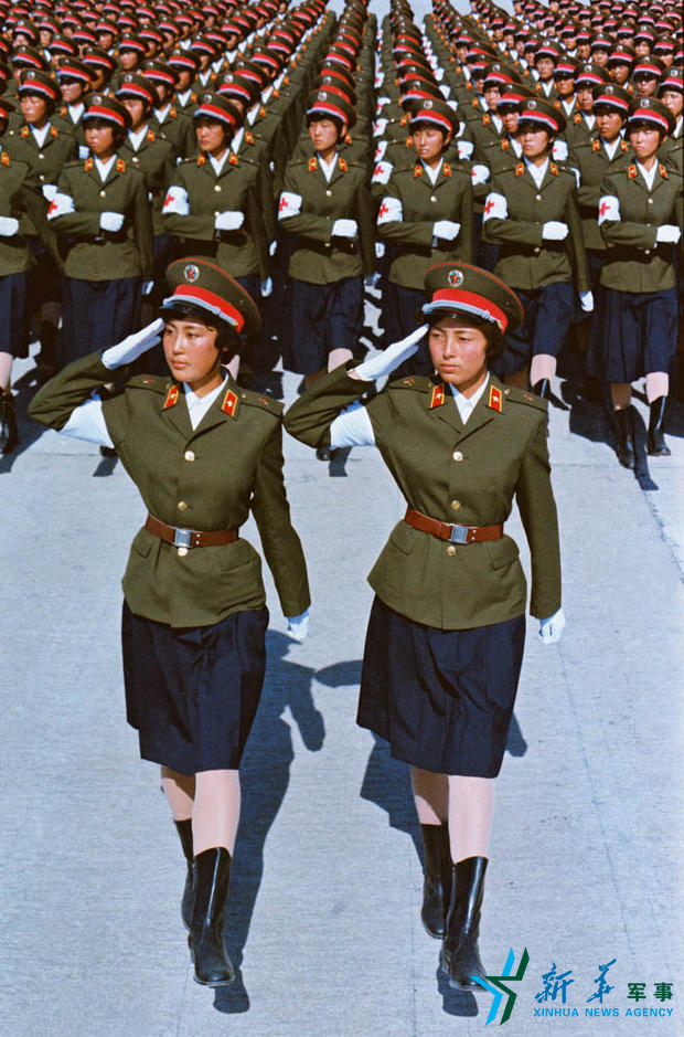 领队为孟伟(左)、白俊平(右)。女兵方队由白求恩军医学校抽组,是建国以来天安门历次阅兵中的第一个女兵方队。