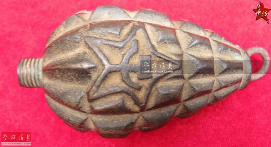 图为绰号“甜瓜雷”的红军自制手雷,其外壳口部的螺纹清晰可见,触发机构就装在这里,此外弹体还铸有镰刀锤子图案,整体铸造工艺相当不错。不过,麻尾手榴弹性能还是比较落后的,引信易受潮,发火机构也不太可靠,误落在水中或泥地上往往没法正常起爆。