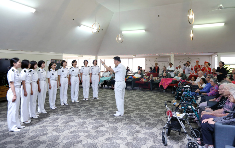 12月3日,在新西兰奥克兰,中国海军郑和舰官兵在一家养老院进行慰问。