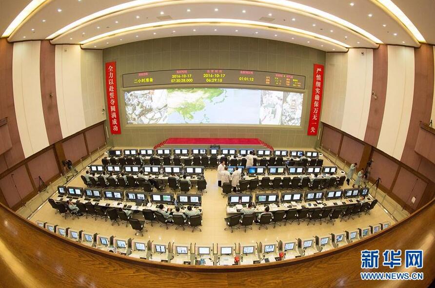 10月17日6时24分拍摄的北京航天飞行控制中心指挥控制大厅。搭载着神舟十一号载人飞船的长征二号F遥十一运载火箭将于7时30分在酒泉卫星发射中心点火升空。新华社记者琚振华摄