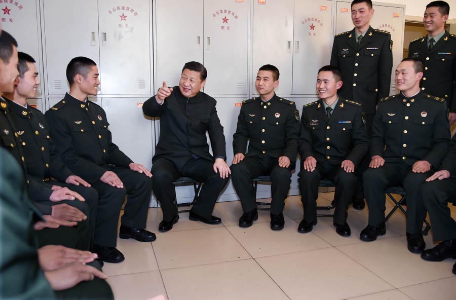 1月23日,中华民族传统节日——鸡年春节来临之际,中共中央总书记、国家主席、中央军委主席习近平专程来到陆军第65集团军,深入基层连队,看望慰问官兵,代表党中央和中央军委,向全军指战员、武警部队官兵、民兵预备役人员致以诚挚问候和新春祝福。这是习近平在该集团军“大功三连”同官兵亲切交谈。新华社记者李刚摄