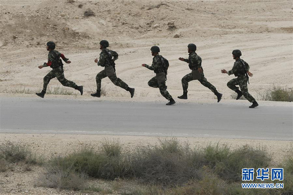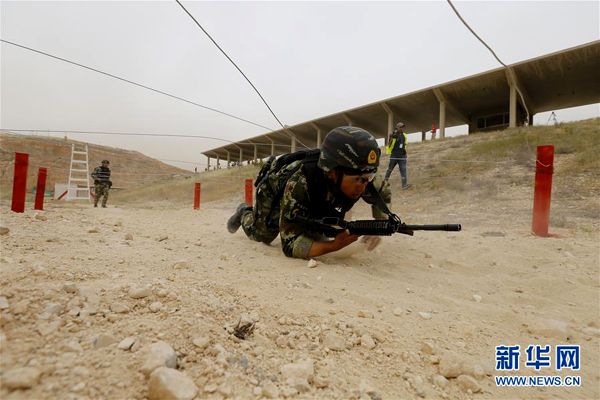 2016年5月3日,在约旦阿卜杜拉国王特战训练中心,中国队队员参加“勇士竞赛”。第八届“勇士竞赛”国际特种兵比武2日在约旦阿卜杜拉国王特战训练中心拉开帷幕,来自12个国家的27支代表队参加这次比赛。新华社发(穆罕默德·阿布·古什摄)