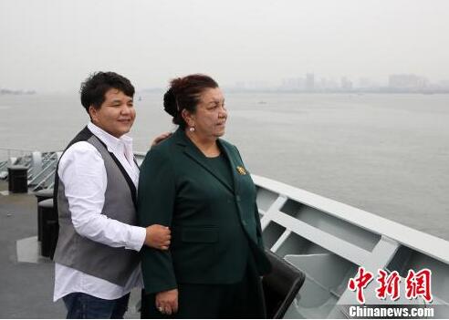 4月23日,阿木拉汗·满苏尔登上黄山舰参观。图为老人与女儿站在舰舷边眺望远方。 吴亢慈 摄