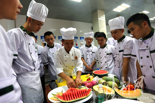 葱爆海参、黑椒牛仔骨、清爽桂花鱼、珍珠虾排拼什果、锅包肉、炸酥条……不到半晌,国家级名厨掌勺示范下的菜品就上了满满一桌,立即引爆全场味蕾。为让炊事员确实学有所获、学有所长,名厨们又利用半天时间对炊事员进行实操技能指导,现场为炊事员释疑解惑、指点迷津,让基层部队的炊事员感到受益匪浅。“大多数人以为部队大锅菜就是乱炖,经过名厨培训点拨,大锅菜也能做成精细菜。”江门边防支队炊事员韦科威如是说。