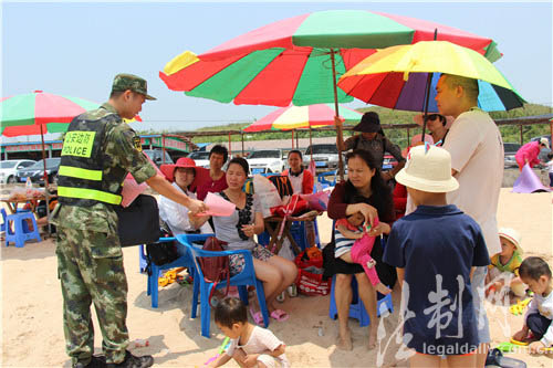 活动中,该所在游客较多的时间点,组织警力深入怪石滩、白浪滩、白沙湾等热门海边景点,向游客发放防溺水、防盗以及防小孩走失宣传单,并提醒游客在游玩过程中,要提高安全防范意识,注意人身和财产安全,照顾好身边的小朋友,如发现异常情况可拨打报警电话求助。此外,官兵还对岸边销售救生圈、冲浪板等有游泳设备的商家进行走访,仔细检查配备的消防设施以及在售物品的质量,为游客的安全提供更坚实的保障。此次安全宣传活动共发放安全知识宣传单300余份,检查商家13家,排除各类安全隐患5处。该所此举受到辖区群众和过往游客的一致好评。