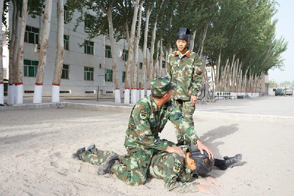 闫大鹏正在认真指导战士训练。南疆的夏天酷热难耐,武警战士却从不言苦和累。他们穿着全套作战服,进行摔擒等训练。闫大鹏带兵细心,哪怕是一个口令、一个动作,也见错即纠。