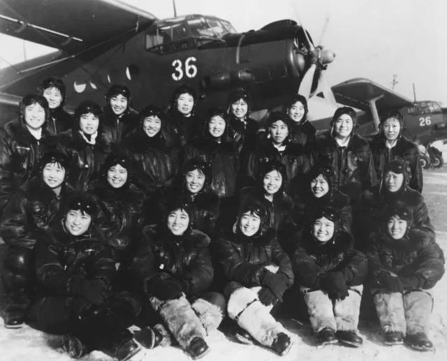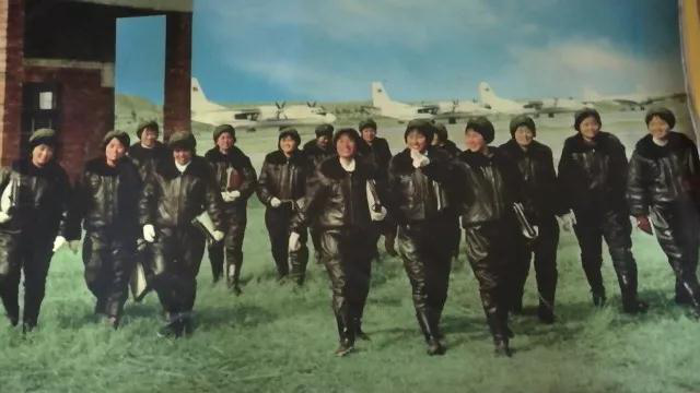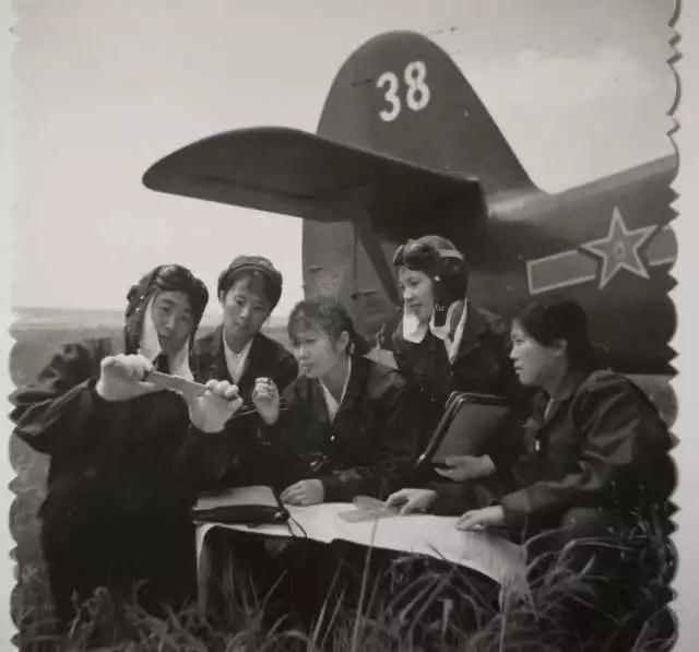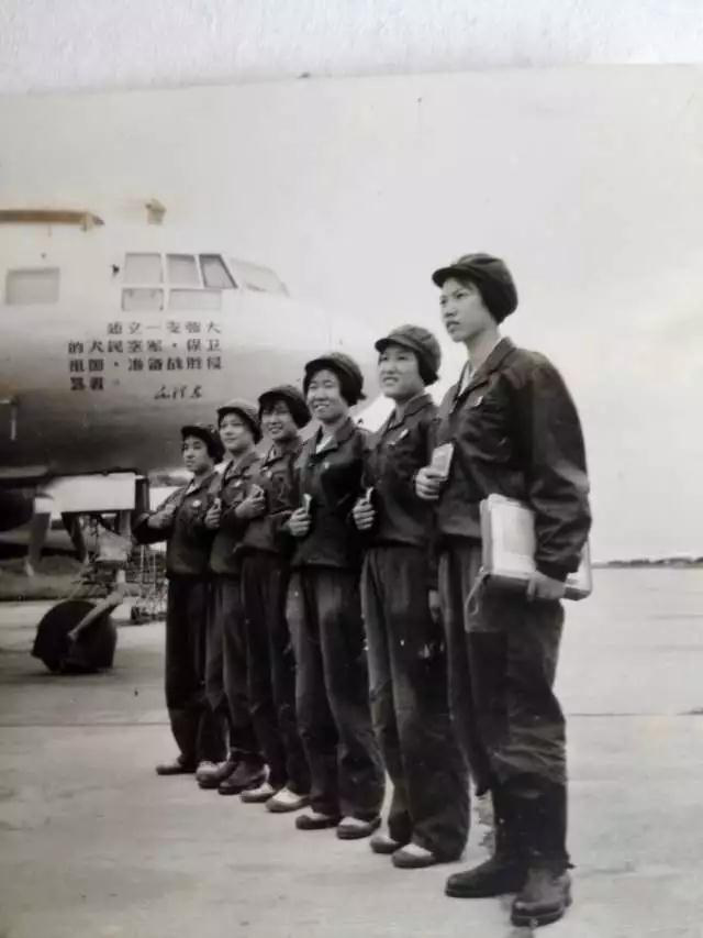 ↑第三批女飞行员与战机合影,排头女飞行员即邢淑华,后面依次为张玉梅、付凤兰、洪莲珍、岳喜翠、郑学英。