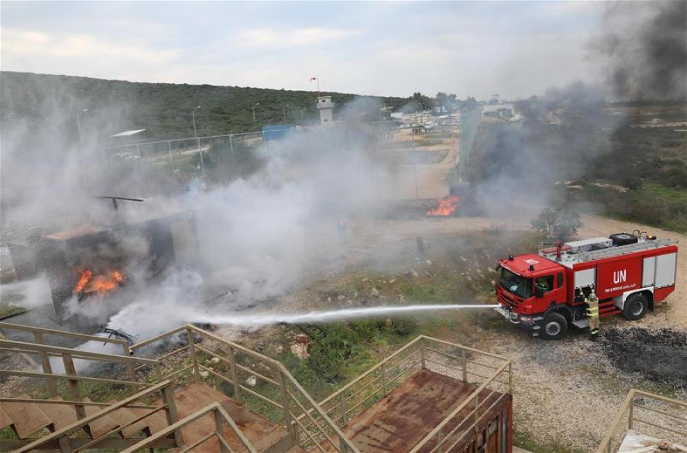 2月18日,在位于黎巴嫩南部纳库拉镇的联黎司令部营区,消防人员在演习现场灭火。新华社发(彭希摄)