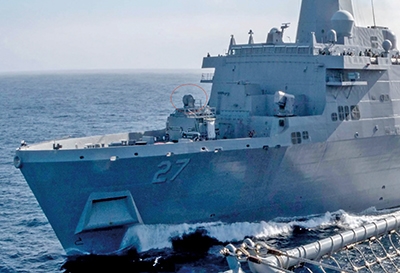 搭载固态高能激光武器的“波特兰”号船坞运输舰,圆圈内是“激光武器展示系统”样机