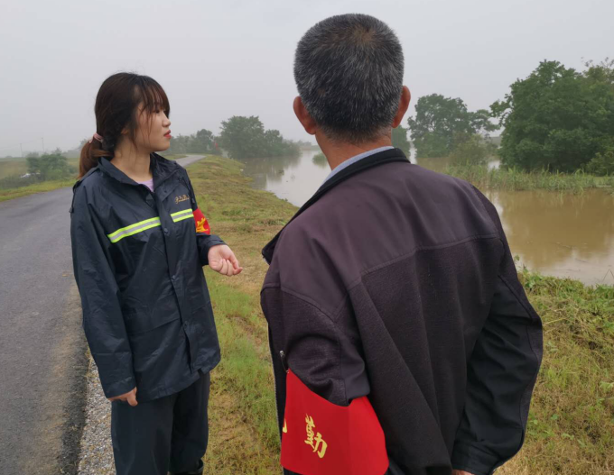 7月15日上午,潘琳婧(韩敏家属)在安徽省郎溪县第二联合大堤朱侯村执勤点执勤,观测水位变化。方林 摄