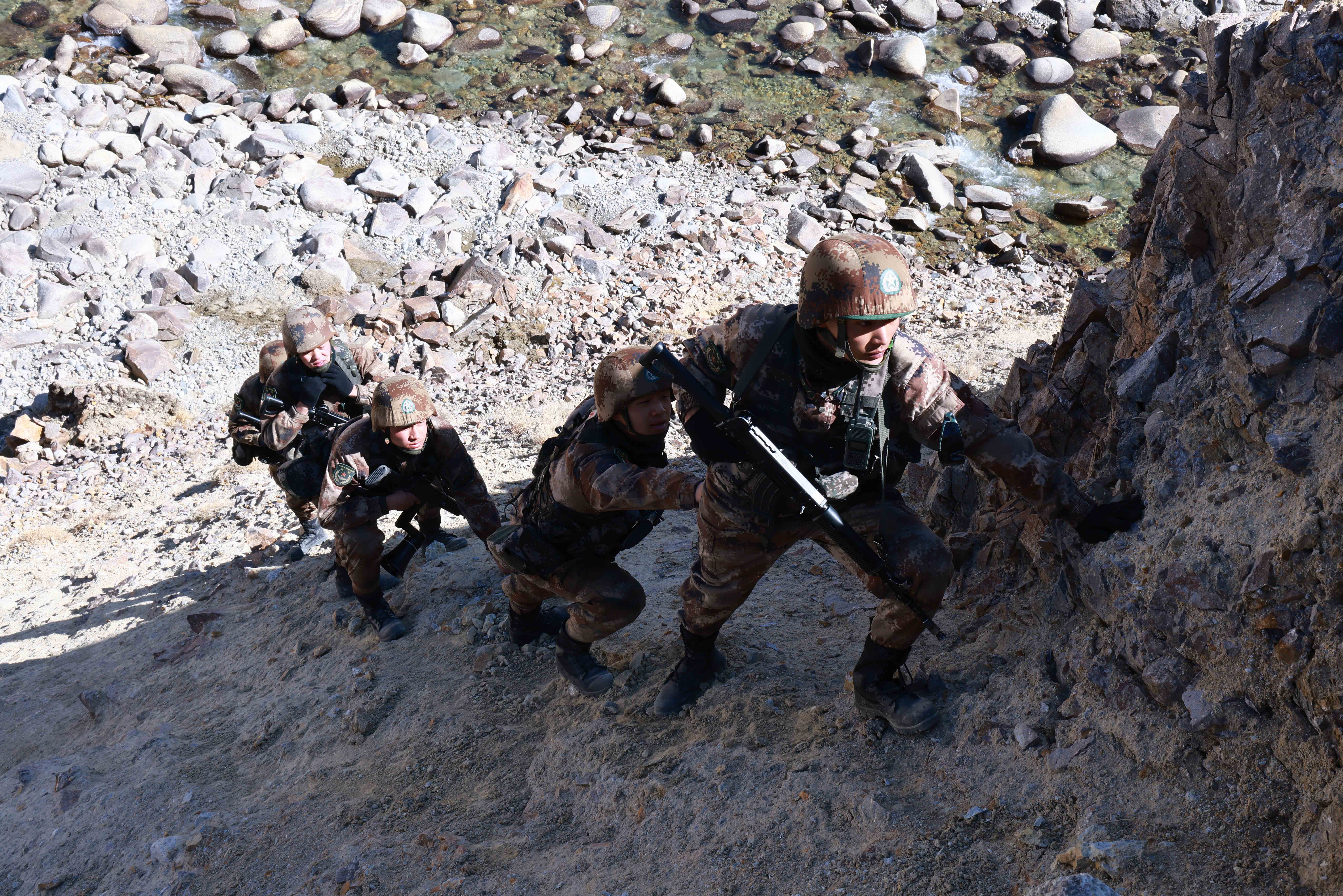 10月3日,驻守在帕米尔高原的新疆喀什军分区某边防团克克吐鲁克边防连官兵巡逻途中翻越陡崖。新华社发(帅佳宏 摄)
