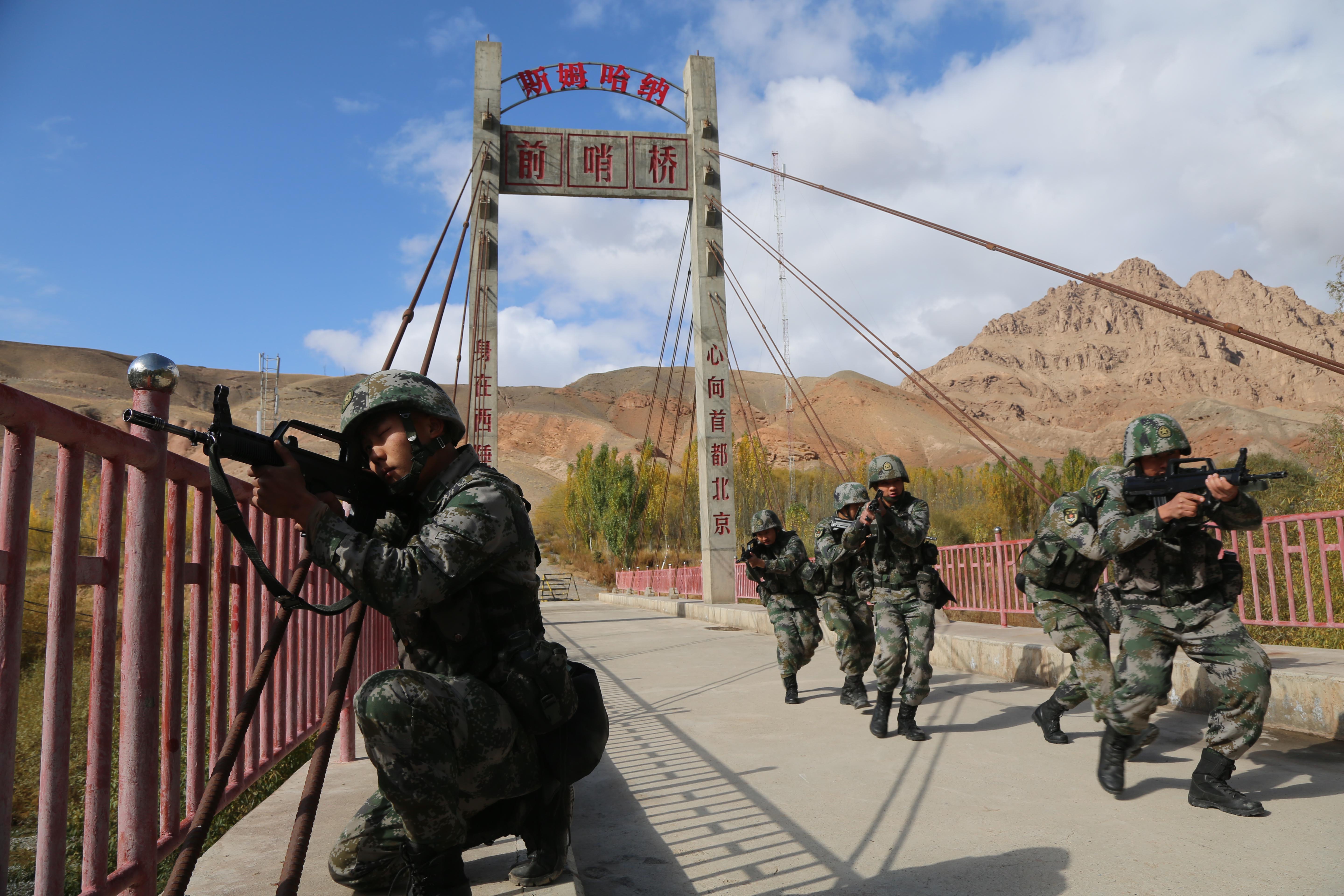 10月3日,驻守在“西陲第一哨”的新疆军区某边防团斯姆哈纳边防连官兵开展防区执勤战备演练。新华社发(刘南松 摄)