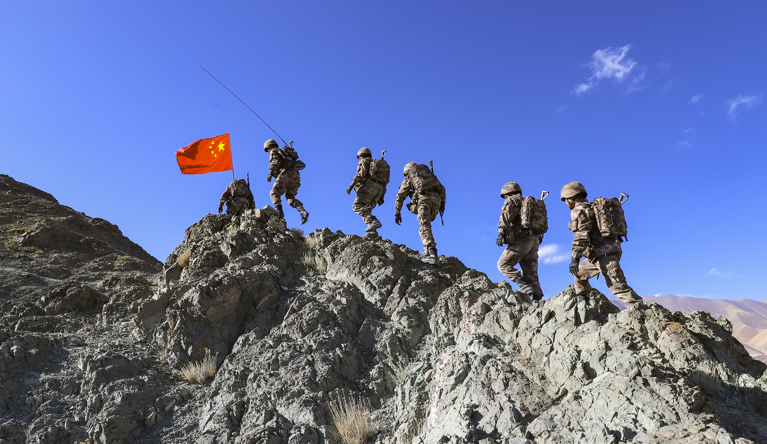 10月1日,西藏阿里军分区某边防团巡逻分队官兵沿山脊向点位行进。新华社发(刘晓东 摄)