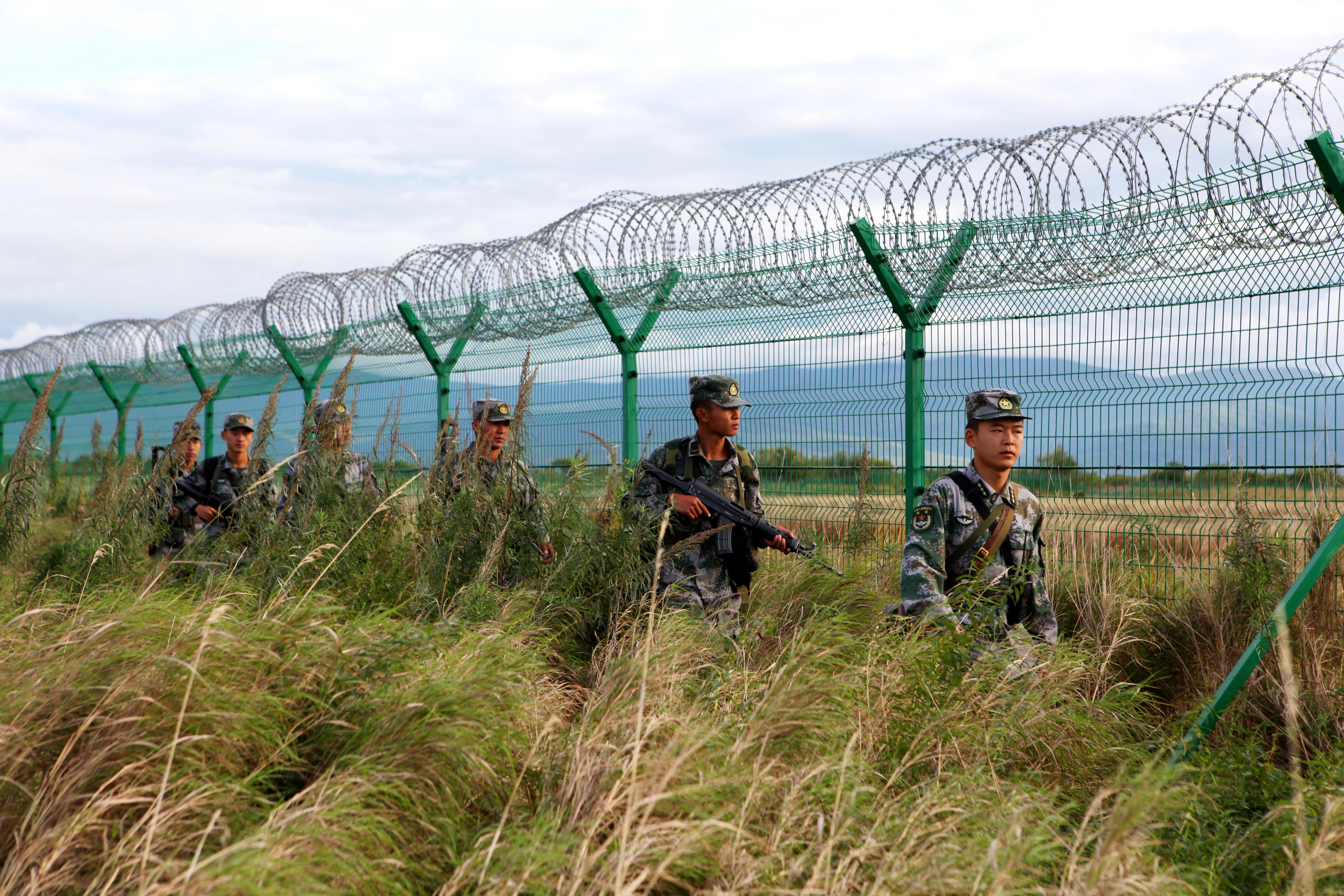 10月1日,黑龙江“东极哨所”官兵沿着黑瞎子岛上的国界线徒步巡逻。新华社发(张泉 摄)