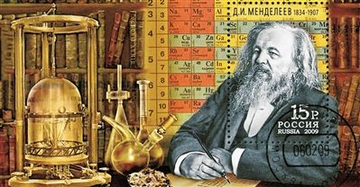 门捷列夫纪念邮票,背景为其发明的化学元素周期表