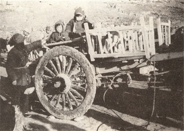 1946年-1949年间,中央托儿所从延安转移至北京途中,孩子们乘坐大木轮马车在行军路上(资料照片)。 新华社发