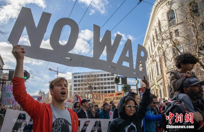 2020年1月4日,两千多人在旧金山市中心参加反战集会。中新社记者 刘关关 摄