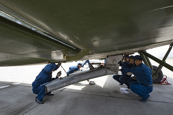 空军某运输搜救团机务人员安装自主研制的飞播器(2020年4月18日摄)。新华社发(刘畅 摄)