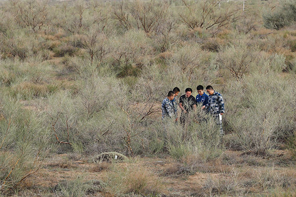 空军某运输搜救团一大队官兵和地方林业人员在内蒙古阿拉善左旗“1992年播区”察看植物生长情况(2020年6月8日摄)。新华社发(刘畅 摄)