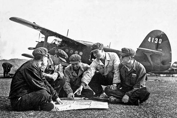 1983年4月,第一代“飞播人”、时任空军某团一大队大队长宋占清(右二)率领一大队多个机组进驻陕西汉中执行飞播造林任务(资料照片)。新华社发