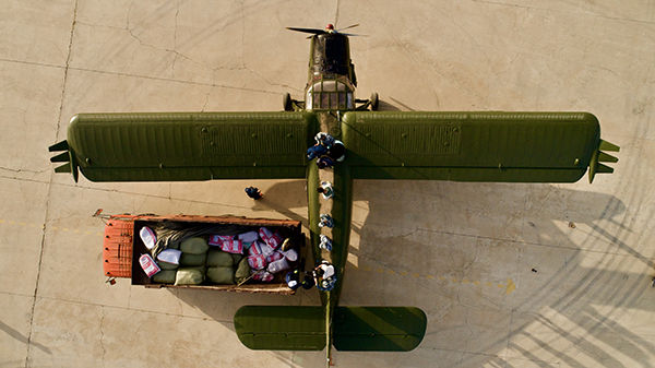 空军某运输搜救团官兵与当地群众密切配合装载种子(2020年6月7日摄)。新华社发(丁少轩 摄)