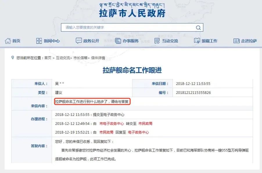2018年12月,拉萨市民政局再次对另一名来信者的咨询作出答复,“目前已和海军部队协商将一艘055型万吨导弹驱逐舰命名为拉萨舰,此项工作已完成。”