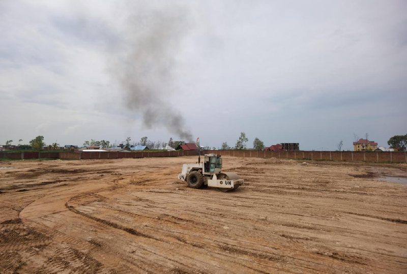 维和官兵操作压路机平整直升机停机坪
