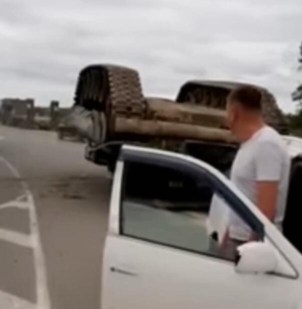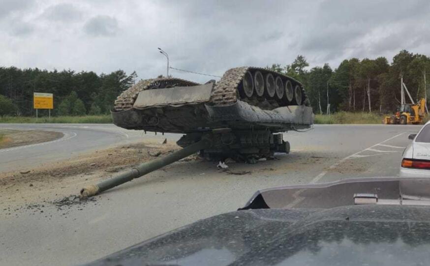 报道称,萨哈林州的交通警察说:“他们扔下了一辆坦克,它就这么躺在路面上。”根据路人拍摄的视频显示,出事的是一辆T-80主战坦克,这辆坦克倒立着,履带朝上,地上还被砸出了一个坑。