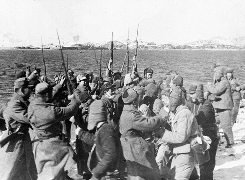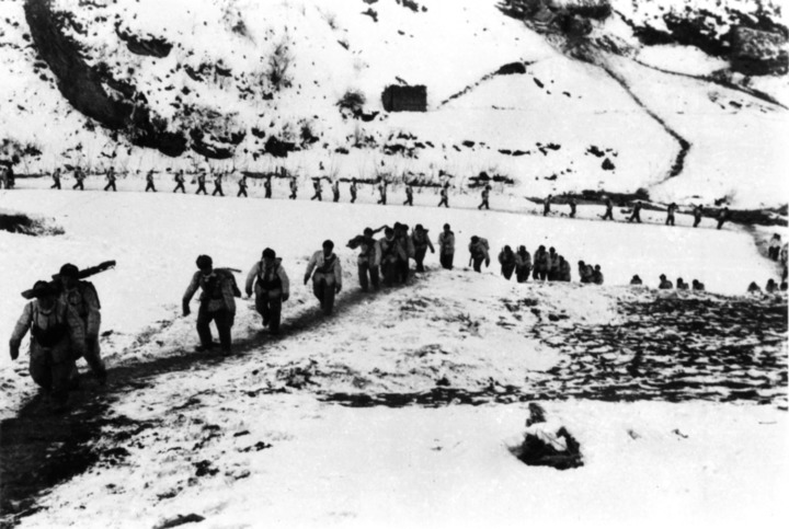 1950年11月25日,美侵略军集结了在朝兵力20万人以上发动了所谓“结束朝鲜战争的总攻势”。但中朝人民军队迅速开始了反攻,使敌人遭受重大损失。图示:肃清长津湖至元山一线敌人后,中朝人民军队在东海岸会师。 张崇岫摄