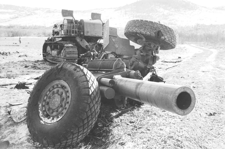 1950年12月,中国人民志愿军配合朝鲜人民军打击美国侵略军和南朝鲜军队,将东线美军阻止在黄草岭以南地区,迫使敌军退至清川江以南。图为在东线战场长津湖畔缴获的美军榴弹炮。新闻摄影局资料 蔡尚雄 葛力群摄