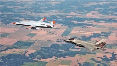 MQ-25A“黄貂鱼”舰载加油机为F-35C隐身战斗机进行空中加油