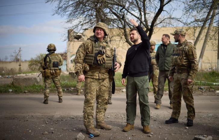4月18日,顿涅茨克地区阿夫杰耶夫卡,俄乌冲突期间,乌克兰总统泽连斯基(中右)访问被严重炮击的前线城镇,并与军人交谈。(视觉中国)