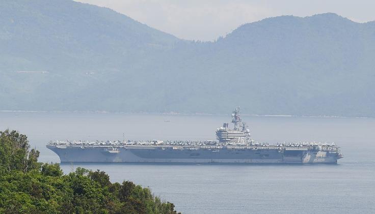 6月25日,越南岘港,美国海军尼米兹级核动力航空母舰里根号驶入港口。(视觉中国)