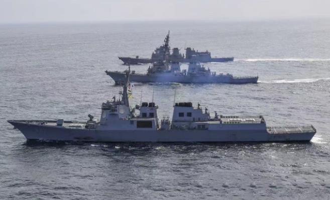 美日韩三国驱逐舰进行海上联合演习 资料图 图源:韩国海军