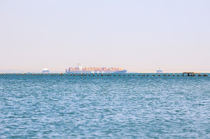 当地时间12月21日,埃及苏伊士,MSC地中海航运公司的一艘集装箱船向南行驶。(视觉中国)