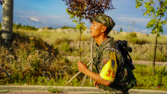 比武人员在五公里武装越野中迎着朝阳拼搏