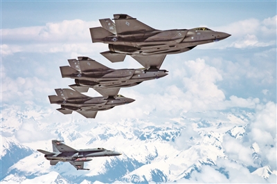 美空军F-35A战斗机在瑞士空军F/A-18C战斗机护航下飞越阿尔卑斯山。