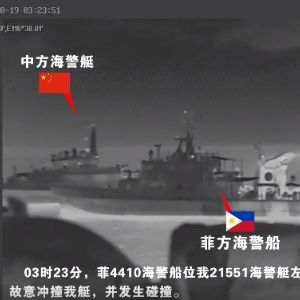 此外,在此次冲闯行动中,菲方舰船再度做出激烈对抗的举动,蓄意冲撞中国海警舰艇。菲方上次采取如此过激的行为还是在6月17日侵闯仁爱礁,企图向非法“坐滩”军舰运送物资期间。