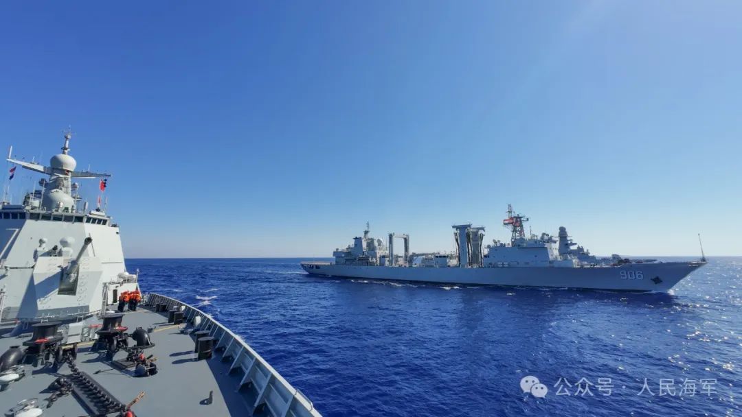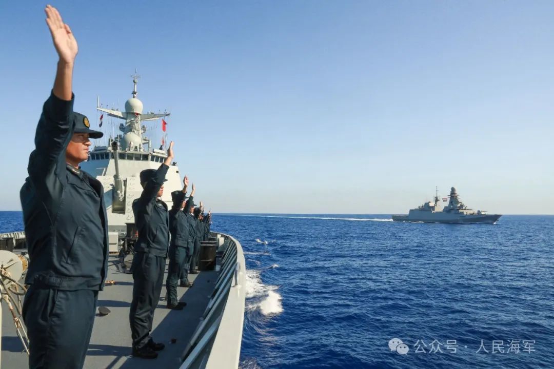 焦作舰、洪湖舰与埃及海军舰艇在预定海域会合后组成编队航行。梁磊 摄