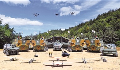 此外,韩国陆军已选择“猛虎”部队作为试点单位,试验列装大型AI自主火炮系统和生物仿真机器人;韩国空军正研究将人工智能技术应用于防空反导领域,以提升拦截效率;韩国海军推出“沿岸AI戒备作战体系”项目,可实现对海岸线周边目标的自动探测、识别和告警,以提升快速反应能力。一段时间以来,无人机、无人装甲车和小型无人艇等装备已成为韩军演训活动的“常客”。