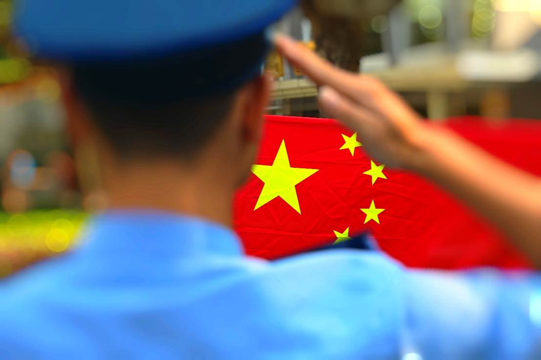 在五星红旗映衬下的橄榄绿